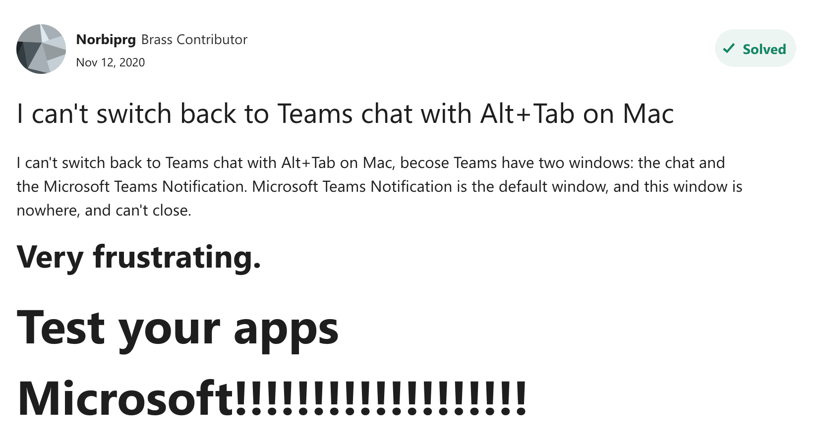 Sometimes it’s just the small things that annoy (Future-Håvard: It is certainly possible, were one so inclined, to raise the point that most of the complaints on this page concerns small things.) In Outlook for MacOS, if you click anywhere in the calendar window, it will open up a dialogue box for adding a new event. If try to close it, it will ask to confirm that you want to close it. Even if it’s completely empty. That is just stupid. Add a small check for the confirmation window to ensure there is at least something in the box for it to pop up, like any sane program would.