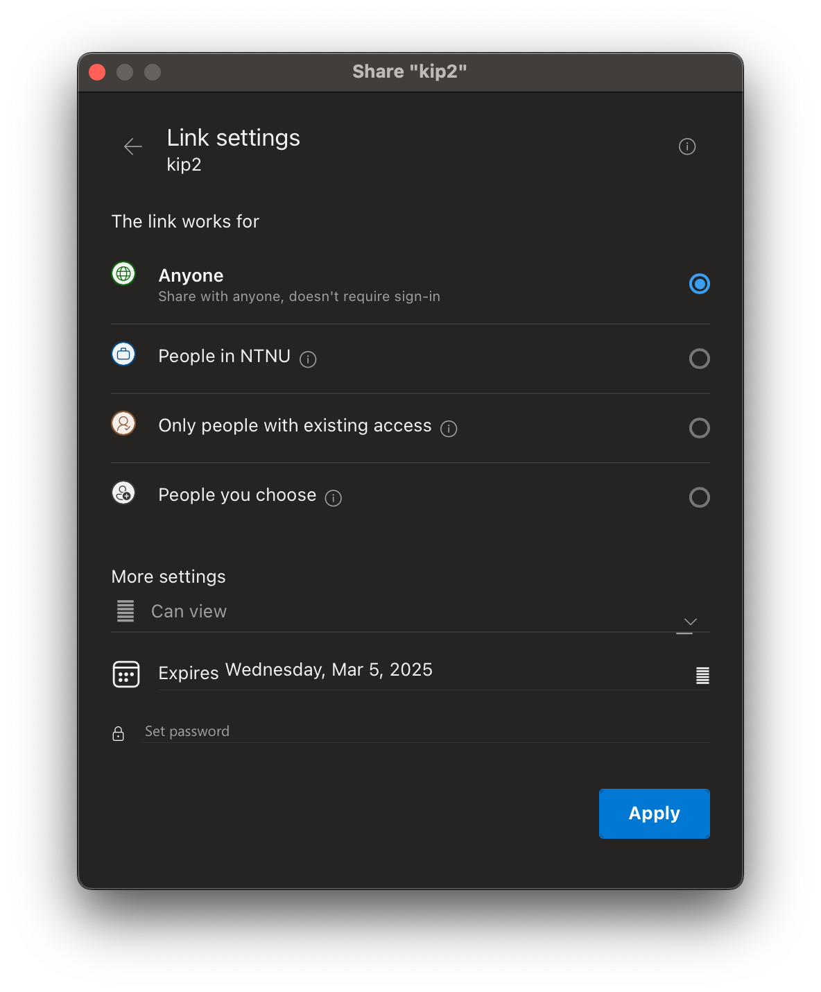 OneDrive is restrictive to the point of destructiveness sometimes. Combine this with Microsoft’s penchant for random behaviour and you have an explanation for the trust issues I have developed for Microsoft’s crapware. I have previously complained about how hard it is to share a file across the Windows ecosystem. Say you actually want to share access to a file that lies in OneDrive. You have several options, ranging from restricting access to a few specific people or open access. Open access is wonderful when you need to share the file with some unknown party outside the organisation. I have sent a pdf to an organisation and I don’t know who in that organisation will read it, or when they will read it. OneDrive annoyingly imposes a restriction that the file can only be shared for up to a month in the future. After that time access will revert. Since the organisation needed the file for longer, I went back in to the sharing menu before the month was up and extended it another month. I had planned to do that again today. But when I checked the sharing settings, I saw that OneDrive had, on its own accord changed the link settings from “anyone” to “people you choose”. This is ridiculous. I haven’t choosen anyone, I pointedly wanted to keep the link available to anyone. Presumably now no one at the organisation can access the file anymore. I was able to change the file link to be available to everyone again. But how can you trust OneDrive’s sharing if it randomly reverts your sharing settings without telling you? You have to be able to trust that the tools you use do the thing they specifically say that they do.