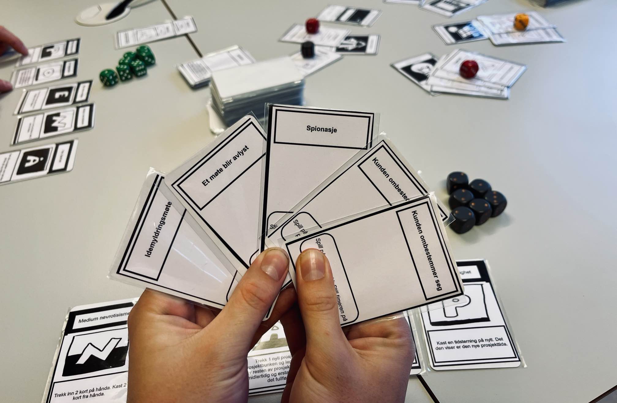 A player can also play interventions on themselves or others: These can have beneficial or detrimental effects (or a combination). A spontaneous meeting will result in a project taking longer to finish, while a job announcement allows the player to draw more cards.